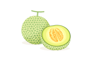 メロン丸ごとと、カットした赤肉などのメロンの組み合わせをイラストにしました。